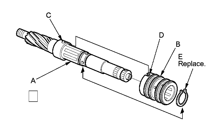 41. Apply power steering fluid to the surface of the pinion shaft (A). Slide the sleeve (B) onto the pinion shaft by aligning the locating pin (C) on the pinion shaft with the cutout (D) in the sleeve. Then install the new snap ring (E) securely in the pinion shaft groove. Be careful not to damage the valve seal ring when installing the sleeve.