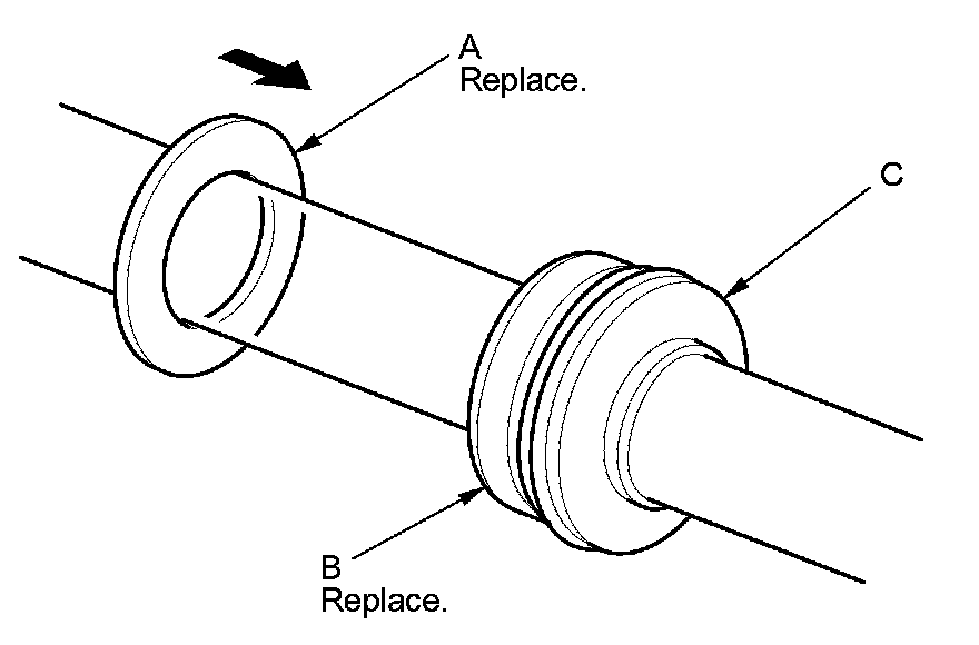 56. Install the new backup ring (A) on the steering rack, then place the backup ring and cylinder end seal (B) against the piston (C).