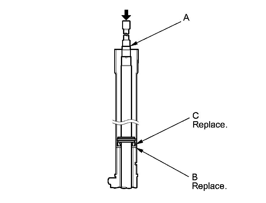 59. Install the backup ring (B) and cylinder end seal (C) into the bottom of the cylinder by pressing on the tool with a press. Do not push on the tool with excessive force as it may damage the backup ring and cylinder end seal.