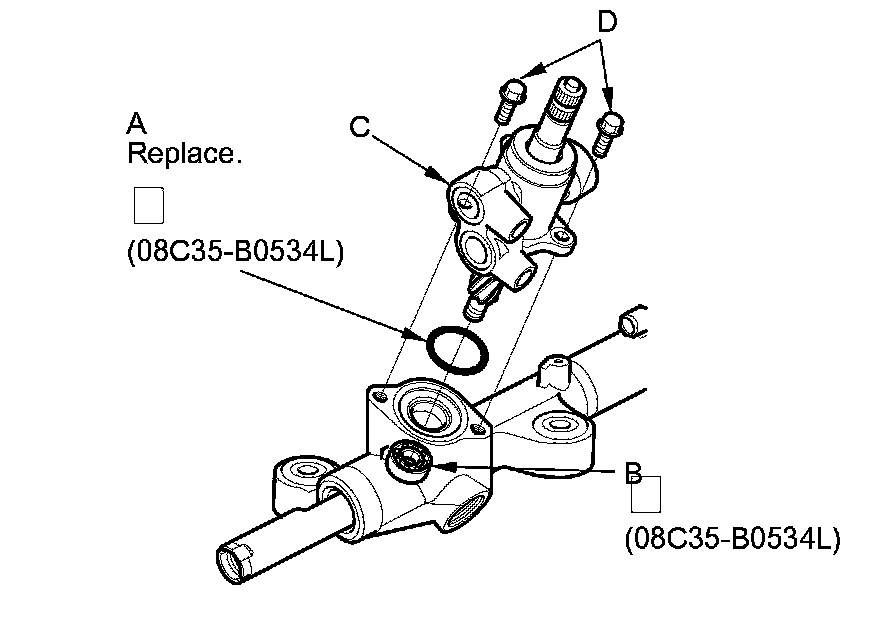 45. Insert the pinion shaft/sleeve into the valve housing (C). Be careful not to damage the valve seal rings (D).