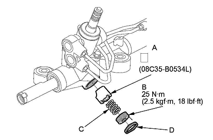 71. Remove the old sealant from the rack guide screw (B), then apply new sealant (Three Bond 1215 or Loctite 5699) to the middle of the threads. Install the spring (C), rack guide screw, and locknut (D).