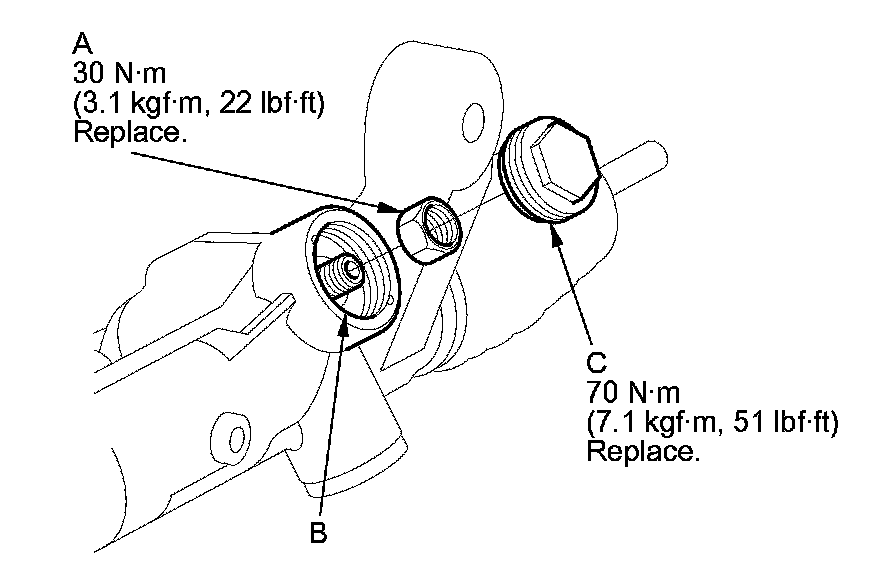 81. Remove the old sealant from the threads on the gearbox housing (B), and apply new sealant (Three Bond 1215 or Loctite 5699) all the way around the threads on the gearbox housing and the new end plug (C). Install the end plug onto the gearbox housing, and tighten it to the specified torque.