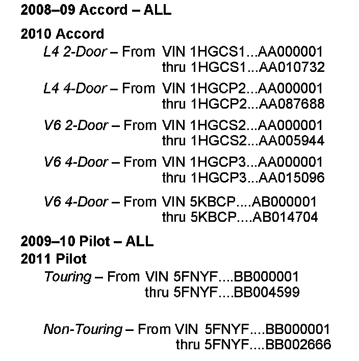 ^ This procedure is in an outline form that you can also use as a checklist for the repair. If you need more details on the item below, bookmark it in the 2008-2010 Accord Service Manual, or the 2009-2011 Pilot Service Manual, or view it online.