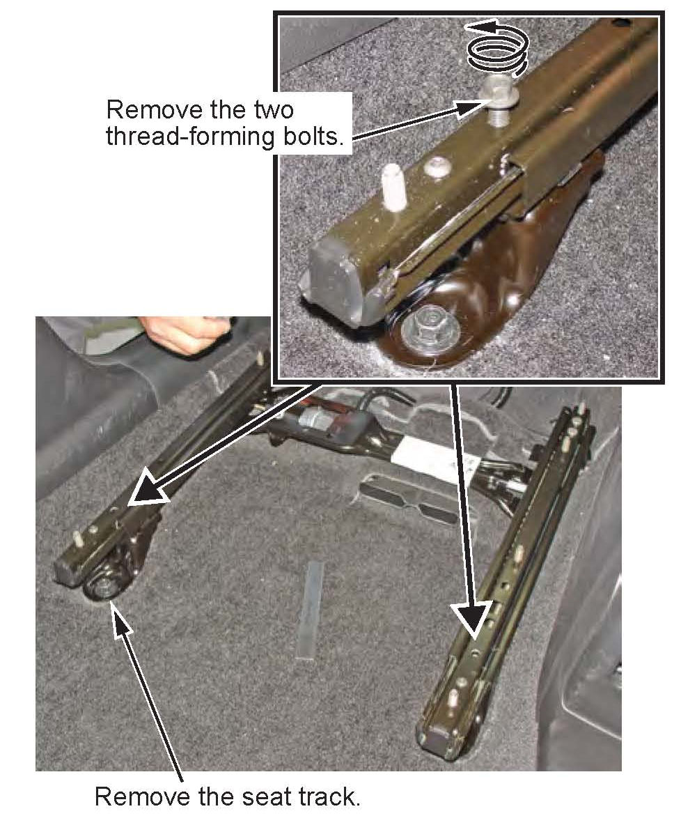 22. Remove the thread-forming bolts from the seat rails, then remove the seat track from the vehicle.