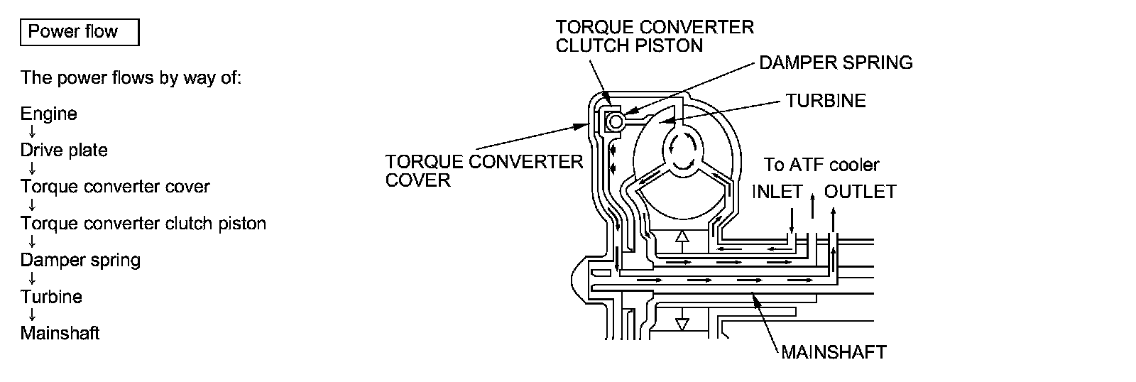 Fluid entered from the chamber between the torque converter cover and the torque converter clutch piston passes through the torque converter and goes out from the chambers between the turbine and the stator, and between the pump and the stator. As a result, the torque converter clutch piston moves away from the torque converter cover, and the torque converter clutch lock-up is released; torque converter clutch lock-up OFF.