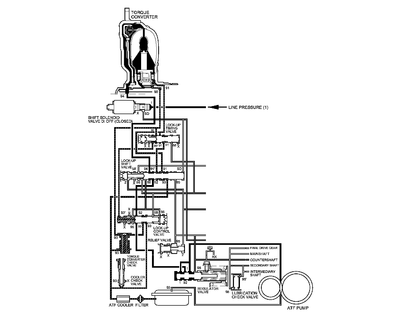 The PCM commands shift solenoid valve D to remain OFF, and shift solenoid valve D covers the shift solenoid valve D pressure port (SD) to the lock-up shift valve. The lock-up shift valve is in the right side, and uncovers the torque converter pressure port (92) leading to the left side of the torque converter. Torque converter pressure (92) from the regulator valve becomes torque converter pressure (94) at the lock-up shift valve, and enters into the left side of the torque converter to disengage the torque converter clutch. The torque converter clutch is OFF.