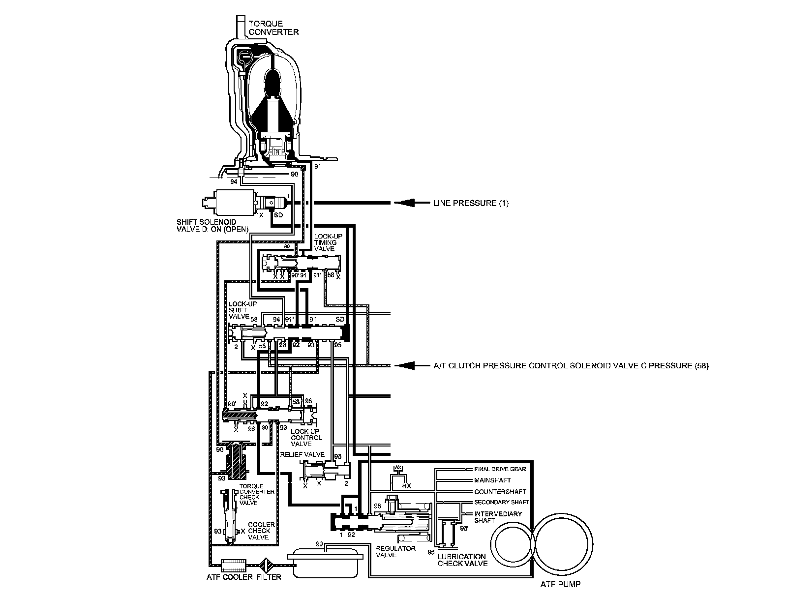 As the speed of the vehicle reaches the programmed value, the PCM turns shift solenoid valve D ON, and shift solenoid valve D uncovers the shift solenoid valve D pressure port (SD) to the lock-up shift valve. The lock-up shift valve is moved to the left side which uncovers the torque converter pressure port (91) leading to the right side of the torque converter to engage the torque converter clutch. The PCM also actuates A/T clutch pressure control solenoid valve C, and A/T clutch pressure control solenoid valve C pressure (58) is applied to the lock-up control valve and the lock-up timing valve. When A/T clutch pressure control solenoid valve C pressure (58) is low, torque converter pressure (91) from the lock-up timing valve is low. The torque converter clutch is engaged partially. A/T clutch pressure control solenoid valve C pressure (58) increases, and the lock-up timing valve is moved to the left side to uncover the torque converter pressure port leading to high. Under this condition, the torque converter clutch is engaged by pressure from the right side of the torque converter; this condition is partial lock-up.