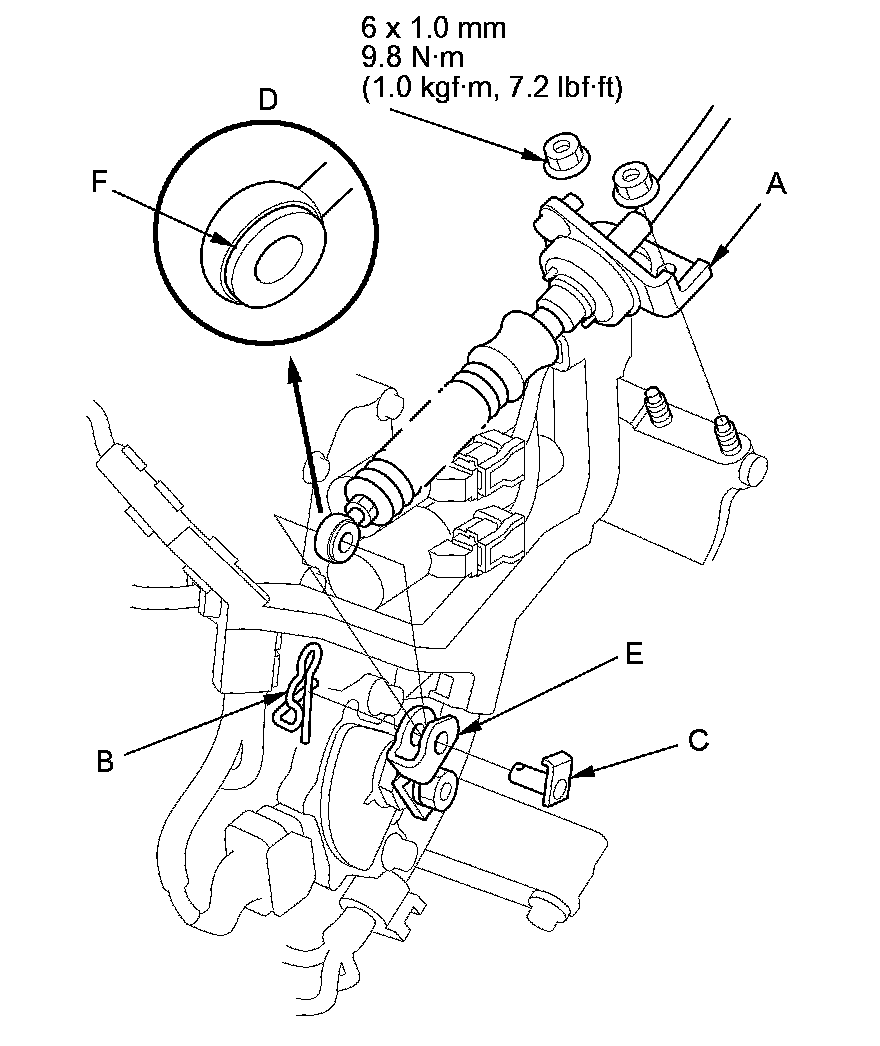 6. Check the bushing (F) in the shift cable end for proper fit and wear. If the bushing is loose or worn, replace the shift cable Service and Repair.