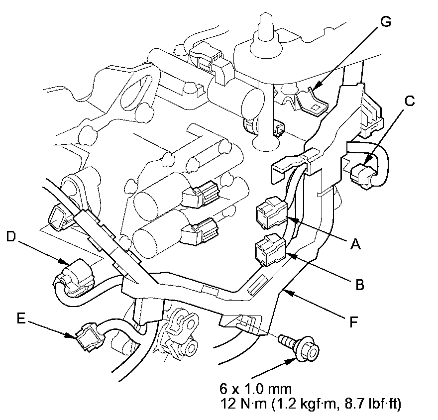 7. Disconnect the A/T clutch pressure control solenoid valve A connector (A), the A/T clutch pressure control solenoid valve B connector (B), the 4th clutch transmission fluid pressure switch connector (C), the shift solenoid wire harness connector (D), and the input shaft (mainshaft) speed sensor connector (E).