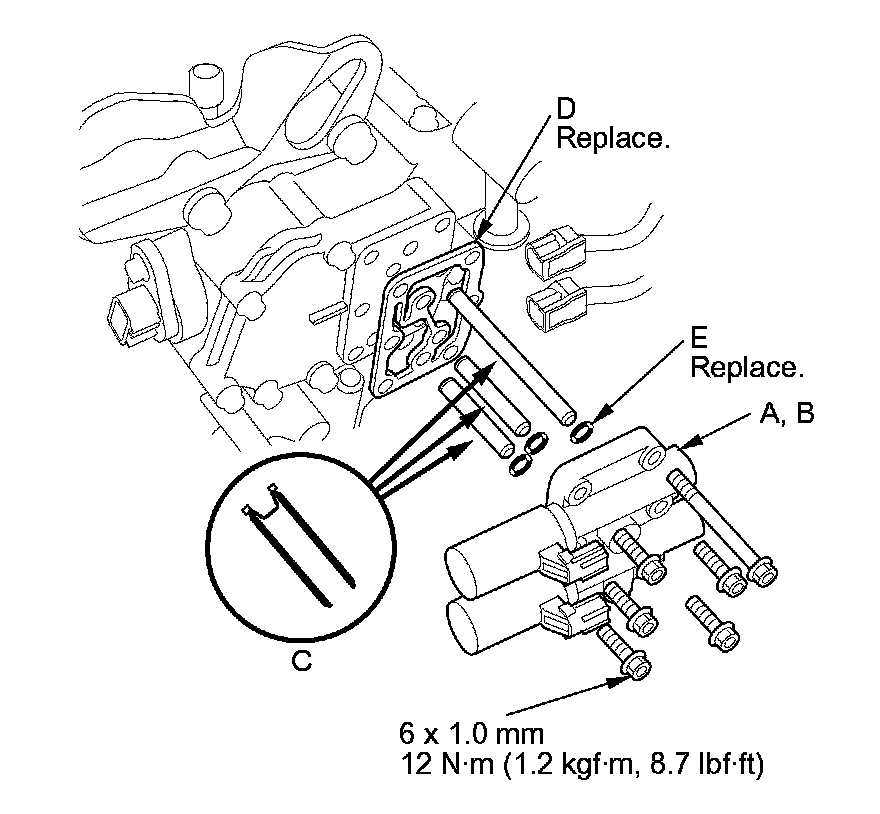 9. Remove A/T clutch pressure control solenoid valves A and B, the ATF pipes (C), the gasket (D), and the O-rings (E).