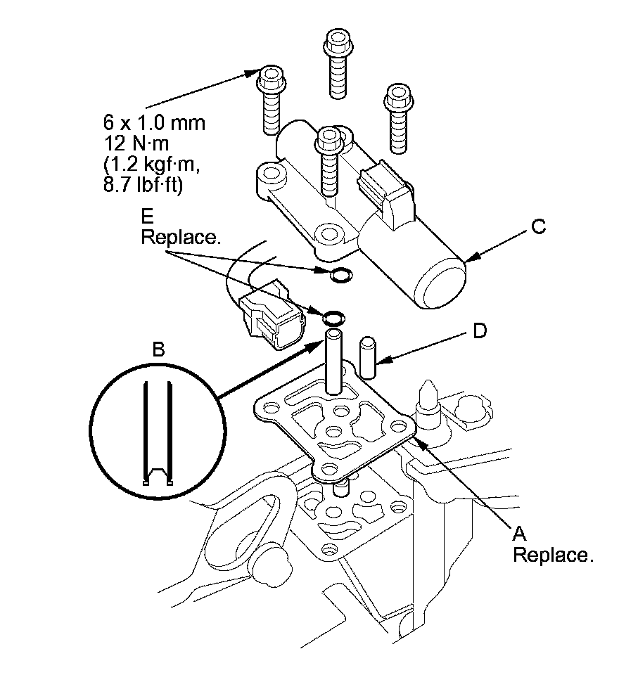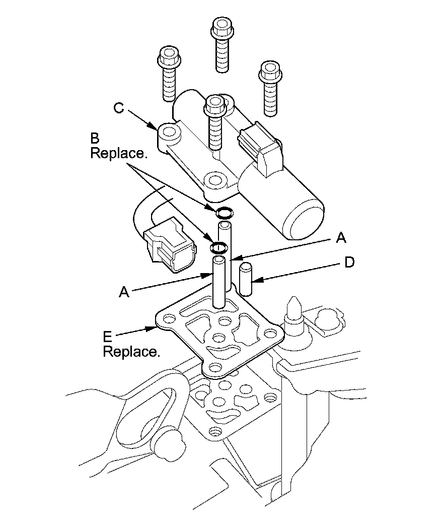 10. Remove A/T clutch pressure control solenoid valve C, the ATF joint pipes (A), the O-rings (B), the ATF pipe (D), and the gasket (E).