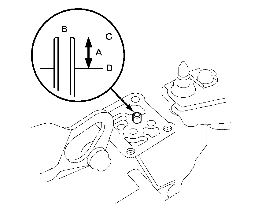 16. Check the height (A) of the 8 x 53 mm ATF joint pipe (B) between the top (C) of the pipe and the solenoid valve body mounting surface (D). The height is about 7.0 mm (0.28 in). If the height is over 7.0 mm (0.28 in), push the pipe until it bottoms in the accumulator body.
