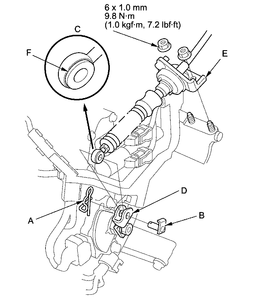 6. Check the bushing (F) in the shift cable end for proper fit and wear. If the bushing is loose or worn, replace the shift cable Service and Repair.