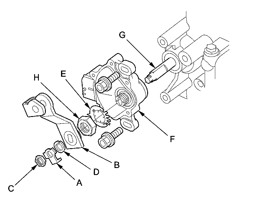 9. Pry the lock tabs of the lock washer (E) on the transmission range switch (F), hold the selector control shaft (G) with a 6.0 mm wrench, and loosen the locknut (H).