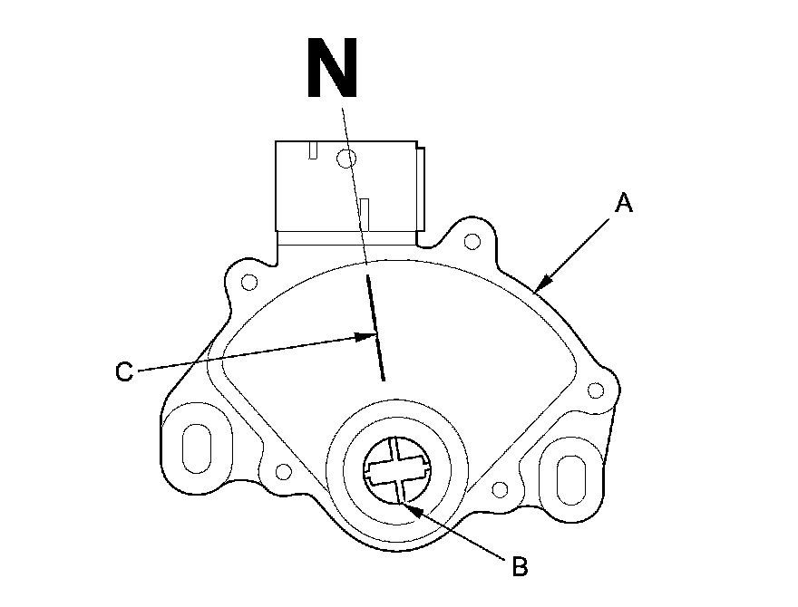 12. Set a new transmission range switch (A) to the N position. The transmission range switch clicks in the N position, and the selector control shaft hole (B) aligns with the N position line (C).