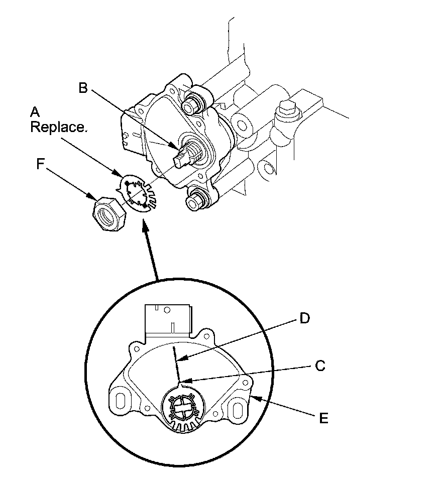 14. Install a new lock washer (A) over the selector control shaft (B) by aligning the indicator tab (C) of the lock washer with the N positioning line (D) on the transmission range switch (E), and install the locknut (F).