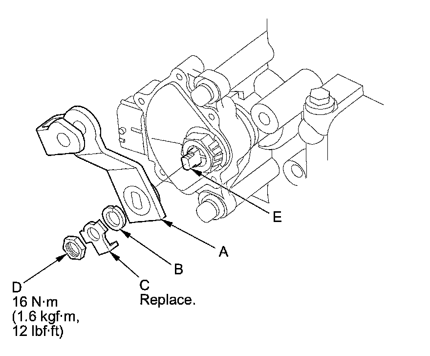 17. Install the selector control lever (A), the spring washer (B), a new lock washer (C), and the locknut (D) on the selector control shaft (E). Bend the lock tab of the lock washer against the locknut.