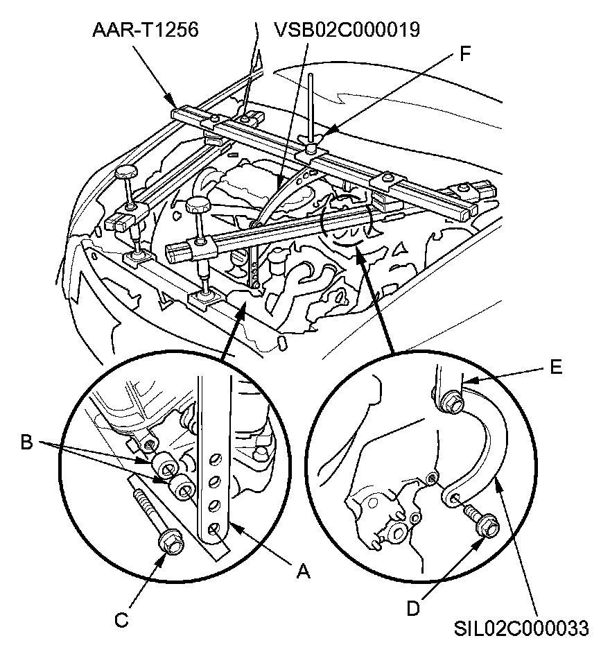 33. Install the engine support hanger to the vehicle, and attach the hook to the engine balancer bar slot. Tighten the wing nut (F) by hand, and lift and support the engine.