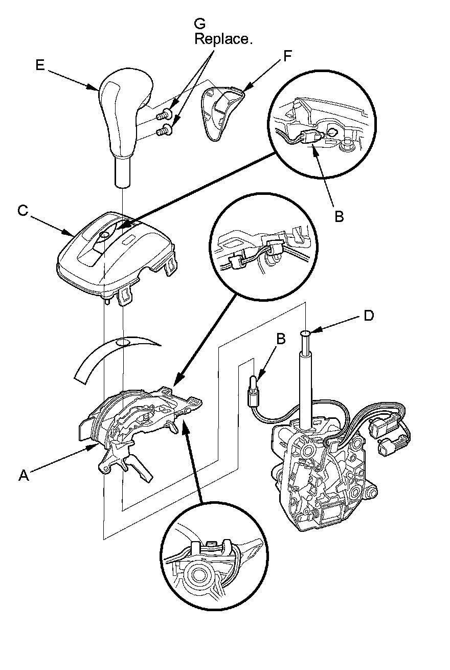19. Install the shift lever knob cover (F) on the shift lever knob with new screws (G).