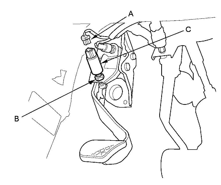 2. Loosen the locknut (B), then remove the clutch pedal position switch (C).