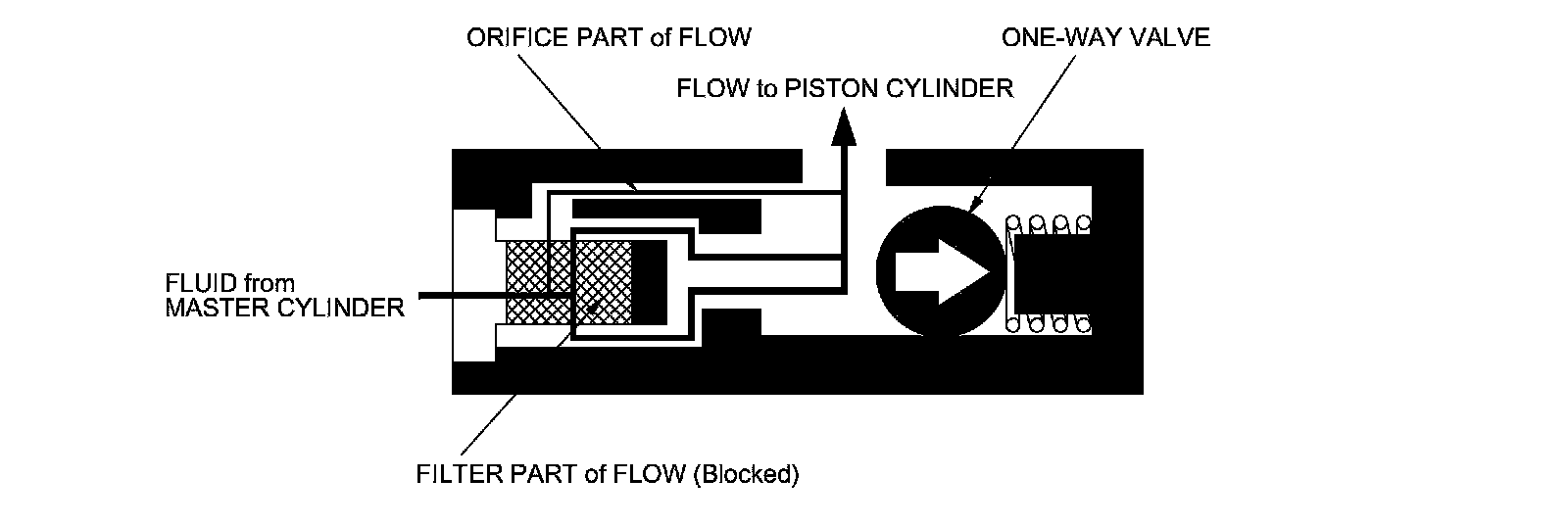 When the clutch pedal is pressed, the fluid pressure from the master cylinder moves the one-way valve in the direction shown in the illustration. The fluid flows through two passages: the orifice part and the filter part. It then flows out to the piston cylinder to release the pressure plate and clutch disc joint.