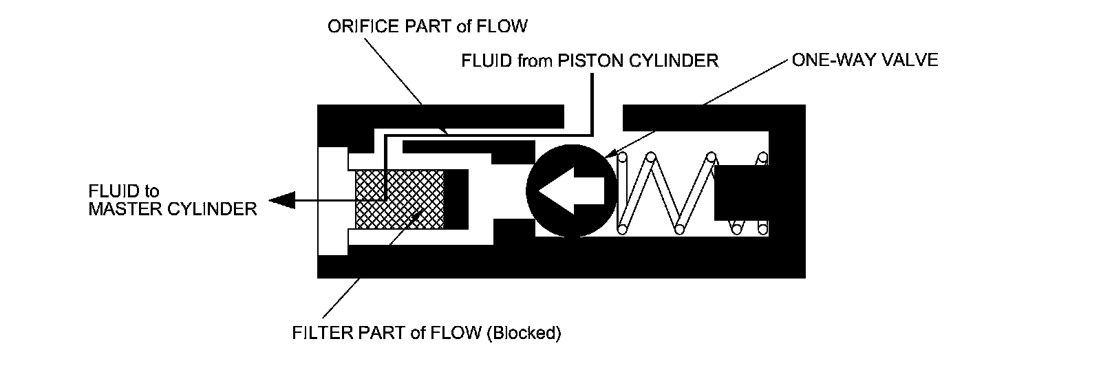 When the clutch pedal is released, the fluid pressure from the piston cylinder moves the one-way valve in the direction shown in the illustration. The one-way valve blocks the filter-part passage and delays the clutch release speed by returning the fluid to the master cylinder through only the orifice-part passage.