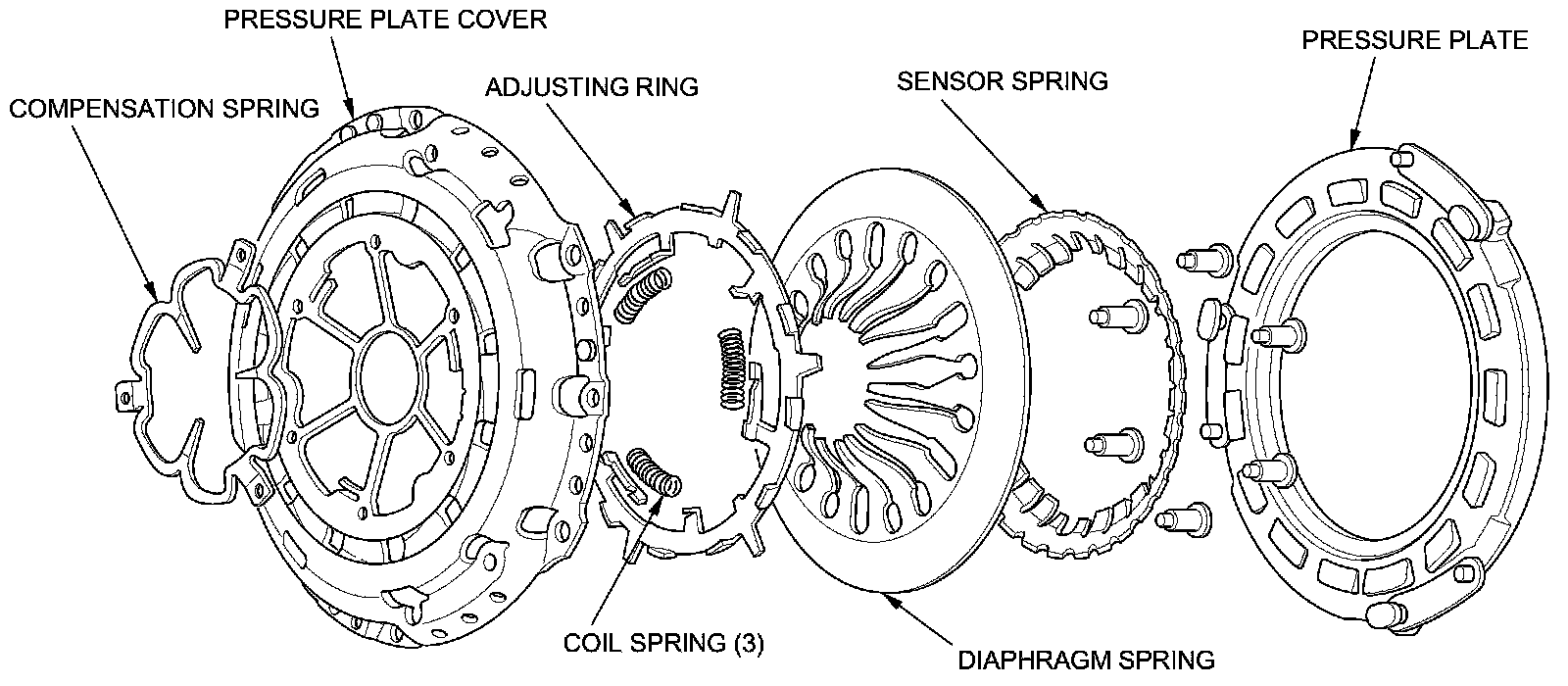The self-adjusting clutch consists of a pressure plate, a sensor spring, a diaphragm spring, an adjusting ring, three coil springs, a pressure plate cover, and a compensation spring. They are riveted together and must not be disassembled. If there is problem with any part of the pressure plate or the clutch disc, they must be replaced together as a set.