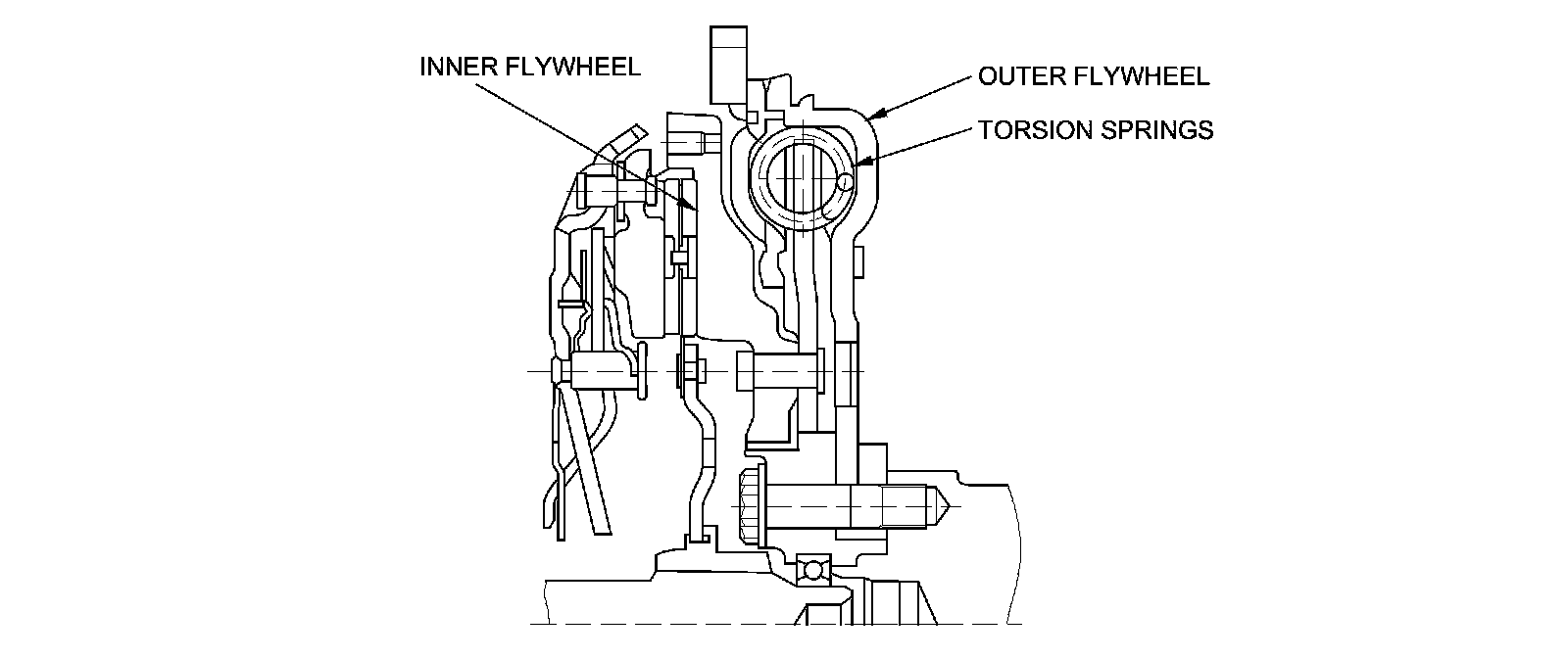 The flywheel assembly is actually two flywheels in one, which raises the inertial mass on both the engine and transmission. The inner and outer flywheels are connected by high and low torsion springs. This combination effectively dampers changes in engine speed before they are transmitted to the transmission.