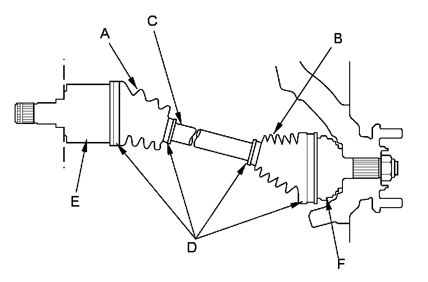 3. Check the inboard joint (E) and the outboard joint (F) for cracks and damage. If any damage is found, replace the inboard joint or the outboard joint as an assembly.