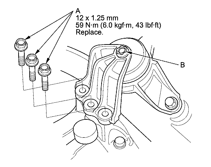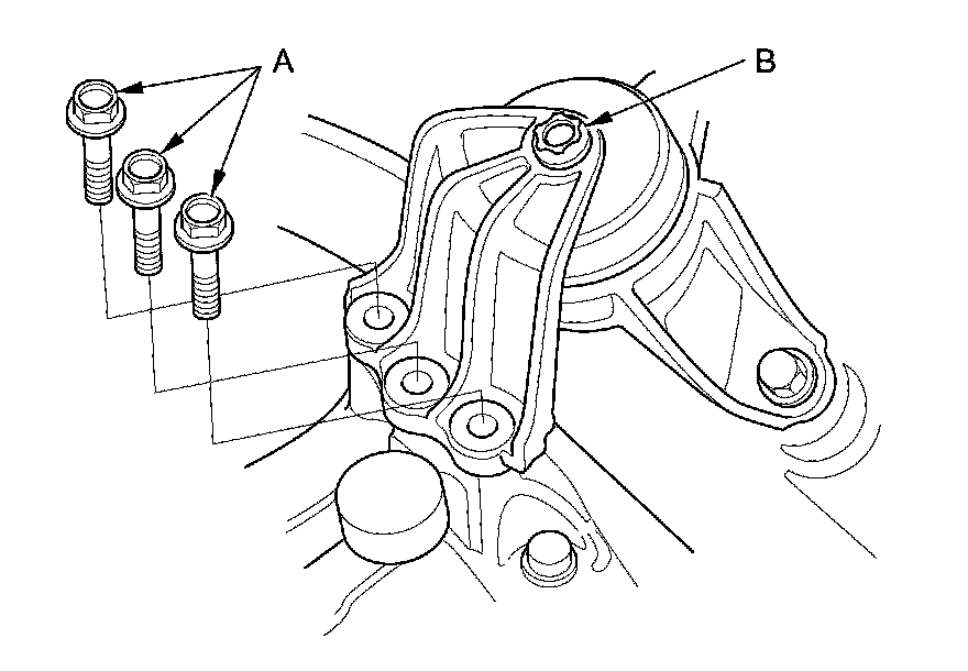 NOTE: Do not remove the TORX bolt (B) from the upper transmission mount. If the TORX bolt is removed, the upper transmission mount must be replaced as an assembly.