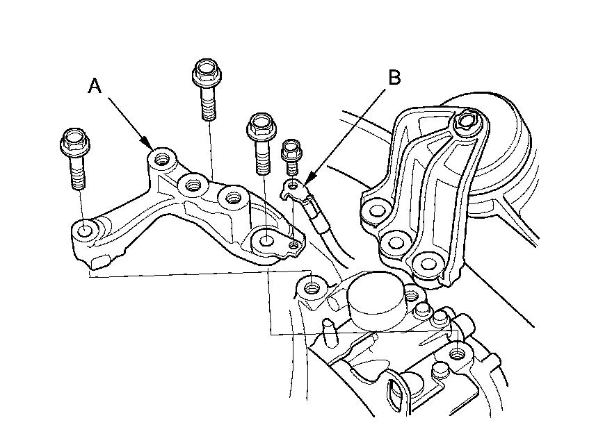 14. Install the upper transmission mount bracket base (A) with new bolts, and connect the ground cable (B) by installing its mount bolt.