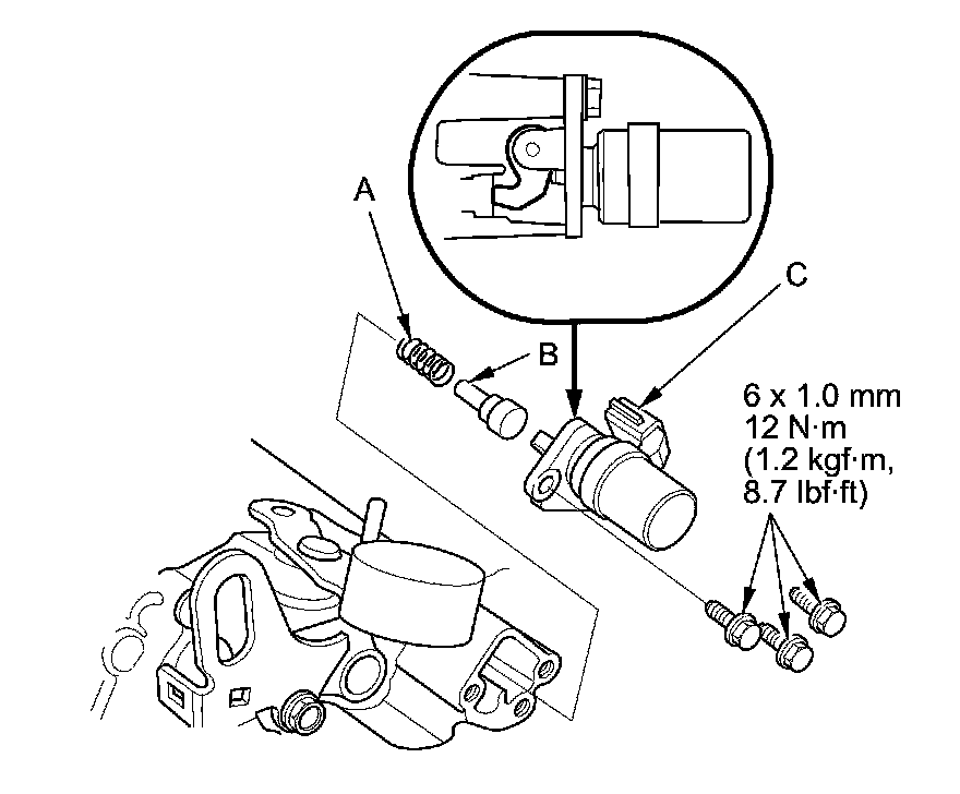 12. Install the select lock pin spring (A), the select lock pin (B), and the reverse lockout solenoid (C) with the flange bolts.