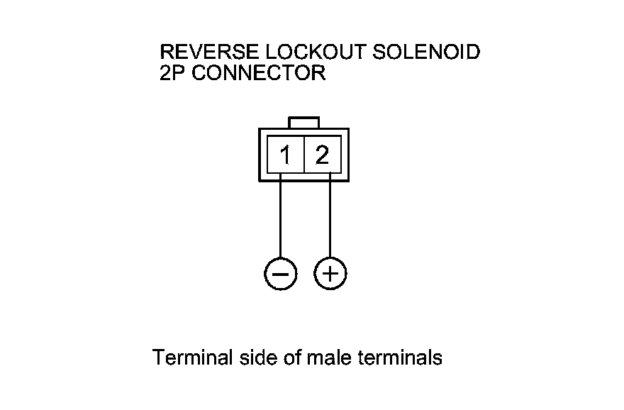 2. Connect jumper wires from the battery positive terminal to reverse lockout solenoid 2P connector terminal No. 2, and from the battery negative terminal to reverse lockout solenoid 2P connector terminal No. 1.