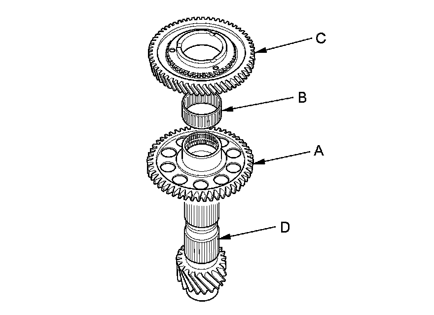 2. Install the countershaft reverse gear (A) with the needle bearing (B), and 1st gear (C) onto the countershaft (D).