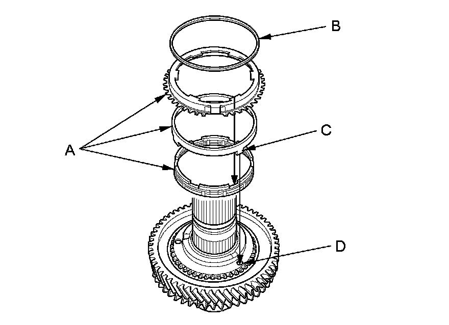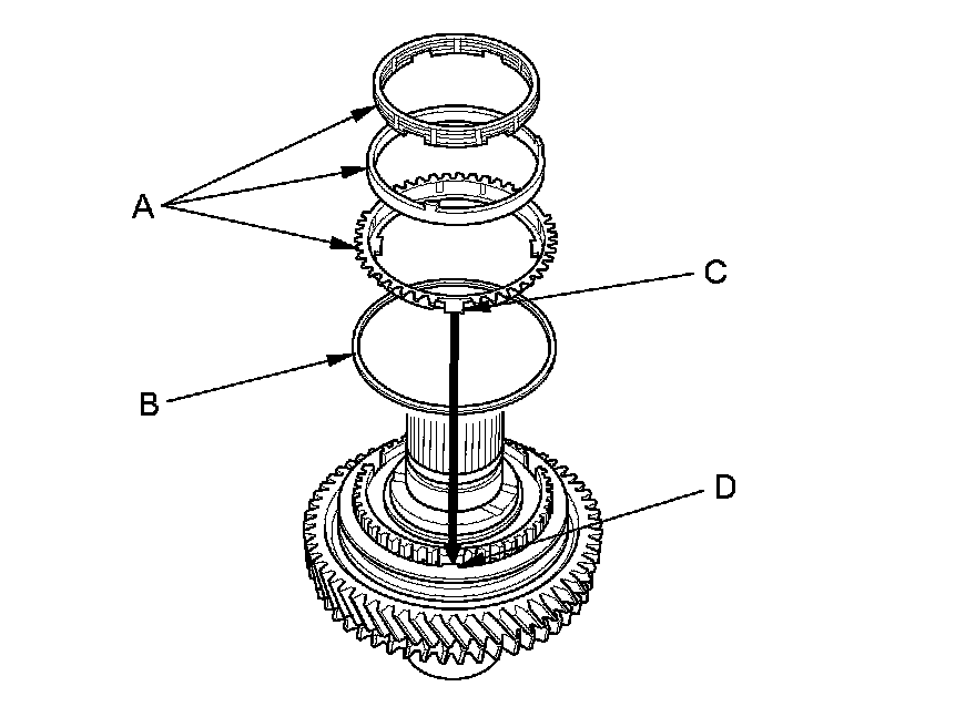3. Install the triple cone synchro assembly (A) with the synchro spring (B) by aligning the synchro cone fingers (C) with the holes (D) in 1st gear.