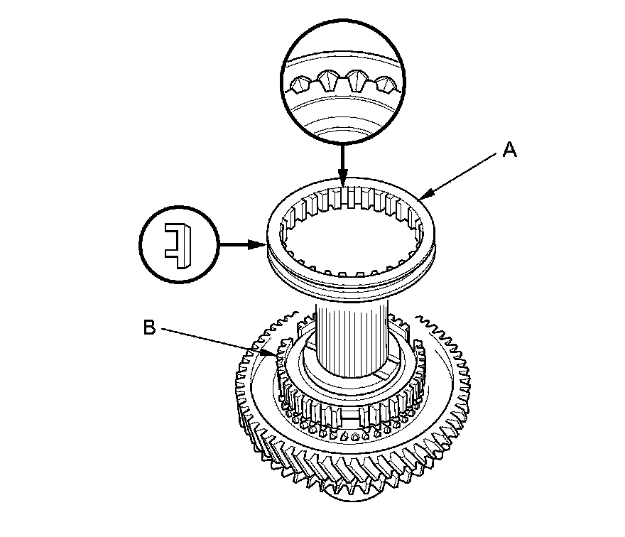5. Install the 1st/2nd synchro sleeve (A) by aligning the slots of the 1st/2nd synchro sleeve and the 1st/2nd synchro hub (B). After installing, check the operation of the 1st/2nd synchro hub set.