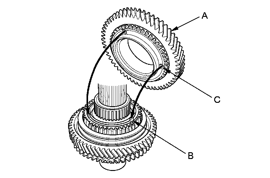 8. Install 2nd gear (A) by aligning the synchro cone fingers (B) with the holes (C) in 2nd gear.