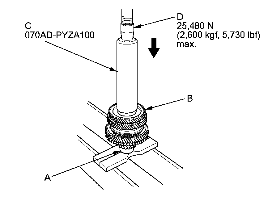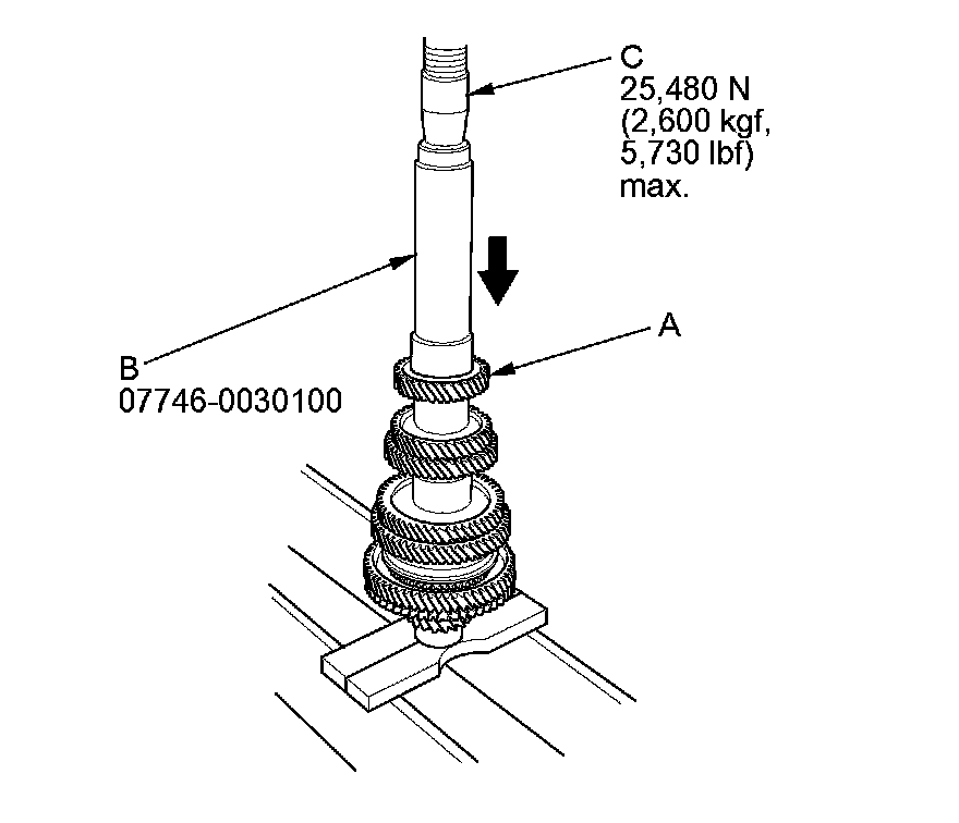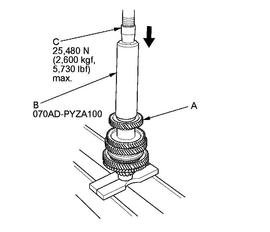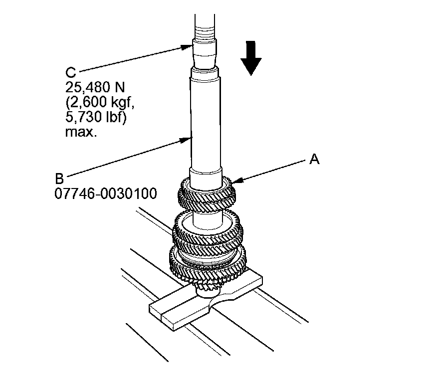 11. Press on 5th gear (A) using the 40 mm I.D. driver handle (B) and a press (C).