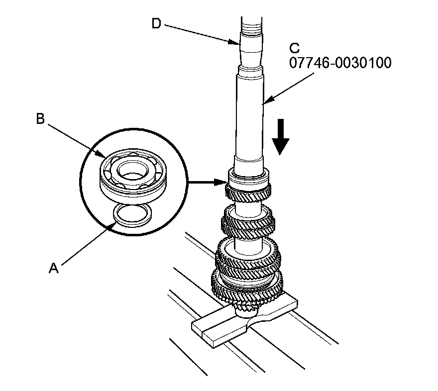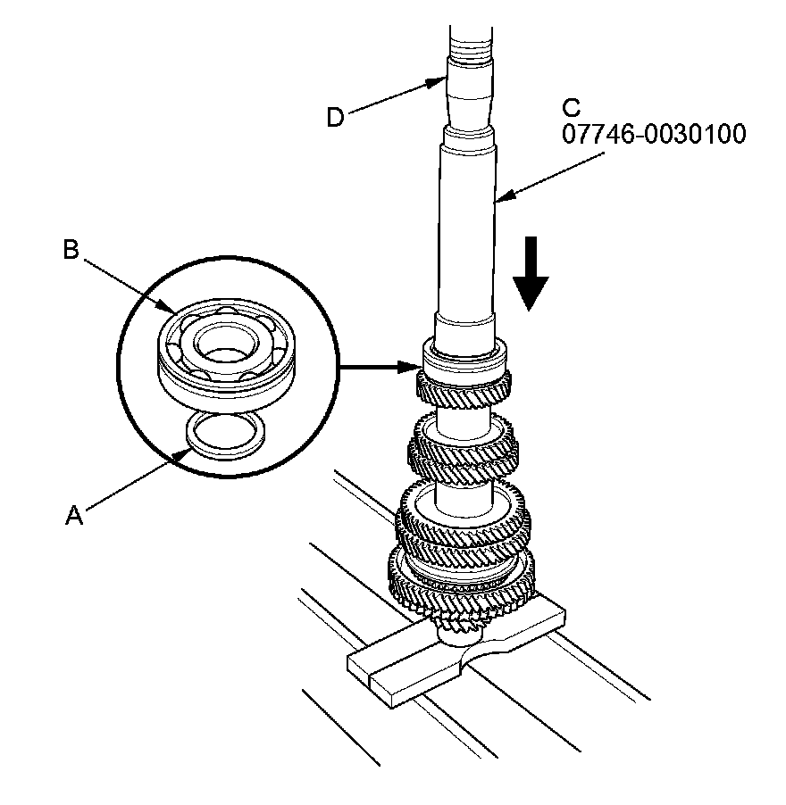 13. Install the 35 mm shim (A) and temporarily press on the used ball bearing (B) using the 40 mm I.D. driver handle (C) and a press (D).