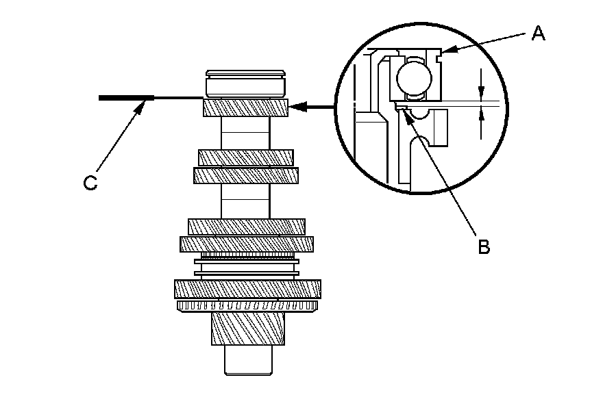 14. Measure the clearance between the bearing (A) and the 35 mm shim (B) with a feeler gauge (C).