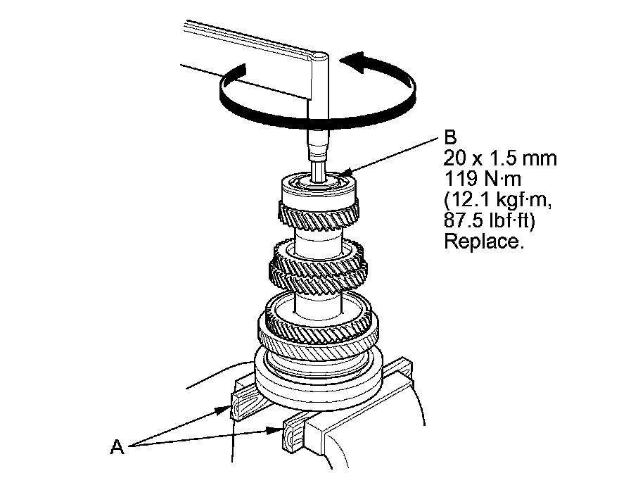 20. Securely clamp the countershaft assembly in a bench vise with wood blocks (A).