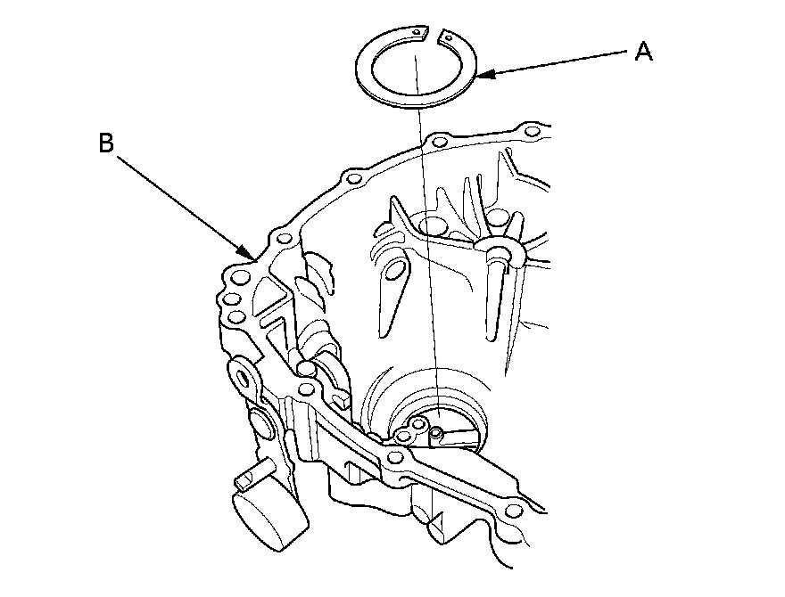 3. Select the proper size 82 mm shim (A) according to the measurements made during the Mainshaft Thrust Clearance Adjustment M/T Mainshaft Thrust Clearance Adjustment. Install it into the transmission housing (B).