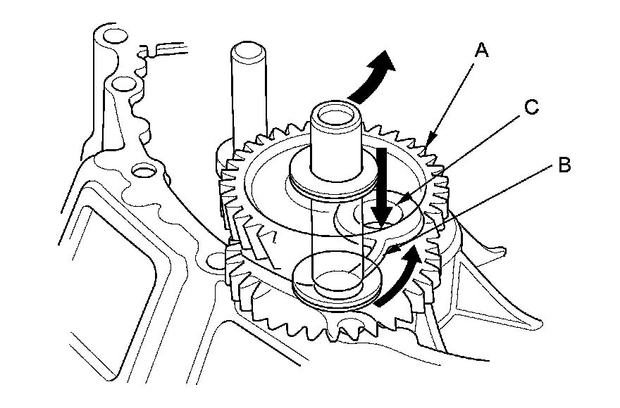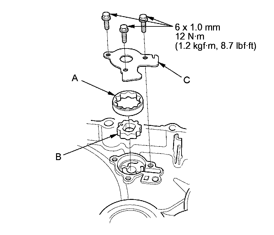 4. Install the oil pump outer rotor (A), the oil pump inner rotor (B), and the oil pump plate (C).