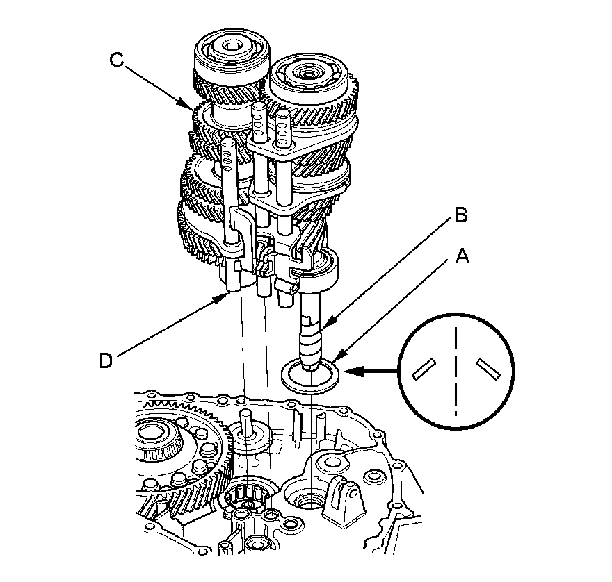 11. Assemble the 20 mm thrust needle bearings (A), the 20 mm thrust washers (B), the reverse idler gear shaft assembly (C), and the reverse shift fork (D) M/T Reverse Idler Gear Shaft Assembly Disassembly/Reassembly.