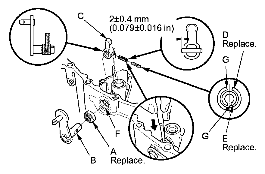 8. Press a new 14 x 20 x 4 mm dust seal (A) into the clutch housing surface, then install the select lever (B), the select arm (C), a new 5 x 22 mm spring pin (D), and a new 3 x 22 mm spring pin (E).