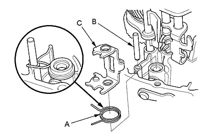 9. Set the select return spring (A), the 8 x 50 mm pin (B), and the interlock (C) as shown.