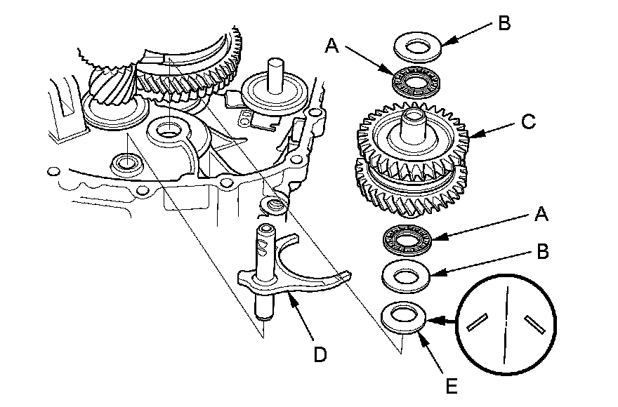 12. Install the 33 mm spring washer (E) to the reverse idler gear shaft assembly. Note the installation direction of the spring washer.