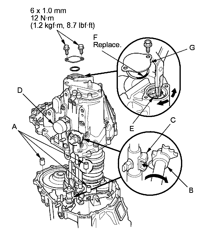 22. Install a new O-ring (F) and the transmission case cap (G).