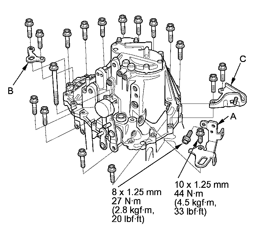23. Install the 10 mm flange bolts finger-tight with transmission hanger B and the clutch line bracket (C), then install transmission hanger (A).