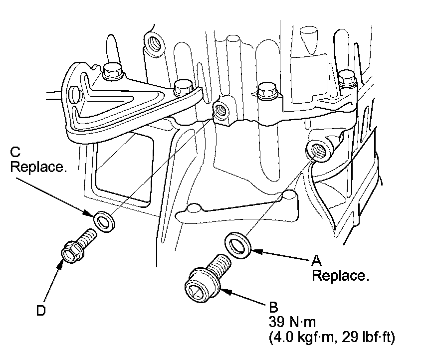 25. Install a new 14 mm sealing washer (A), the drain plug (B), and a new 6 mm washer (C), and install the oil check bolt (D) by finger-tight.